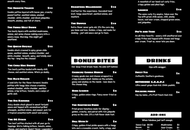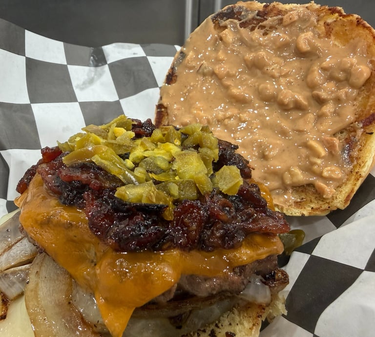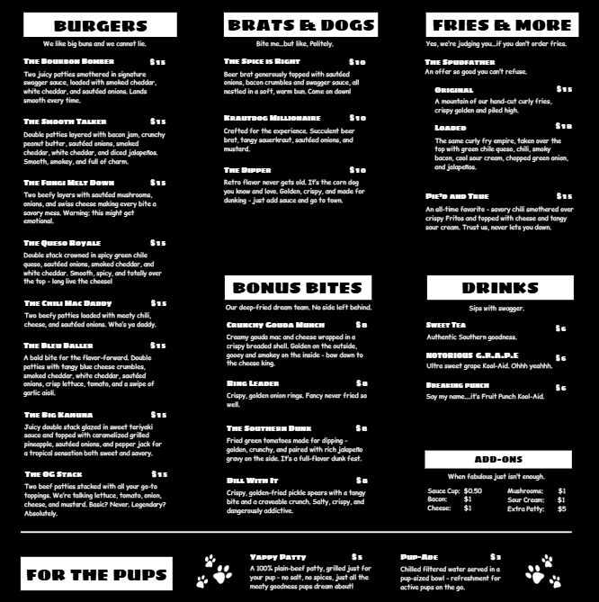 We're your destination for gourmet burgers and savory bites. Our unique flavor pairings and signature Swagger Sauce will have you strutting your stuff. From burgers to brats to towering curly fries, groove to the rhythms coming from our kitchen while your meal is on the way. Visit us at your next local gathering, or get in touch with us to book for your next event. And don't forget to drop by with your pup. Our yappy patties and pup aide are the best treats for our four-legged companions.